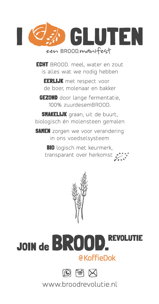 Een belangrijk uitgangspunt voor ons is de herwaardering van graan. In plaats van rassen die zijn geselecteerd op hoge bakkwaliteit voor de industrie, gaan wij voor biologische granen die lokaal zijn geteeld en molensteen gemalen. Dit vraagt om een andere manier van werken. In plaats van gist gebruiken wij zuurdesem, een lange fermentatie en handmatige verwerking. Hiervoor hebben we een nauwe afstemming nodig met de biologische teler en de molenaar. Juist deze werkwijze zorgt voor superlekker en beter verteerbaar BROOD. met meer voedingswaarde, smaak en een duidelijk verhaal.